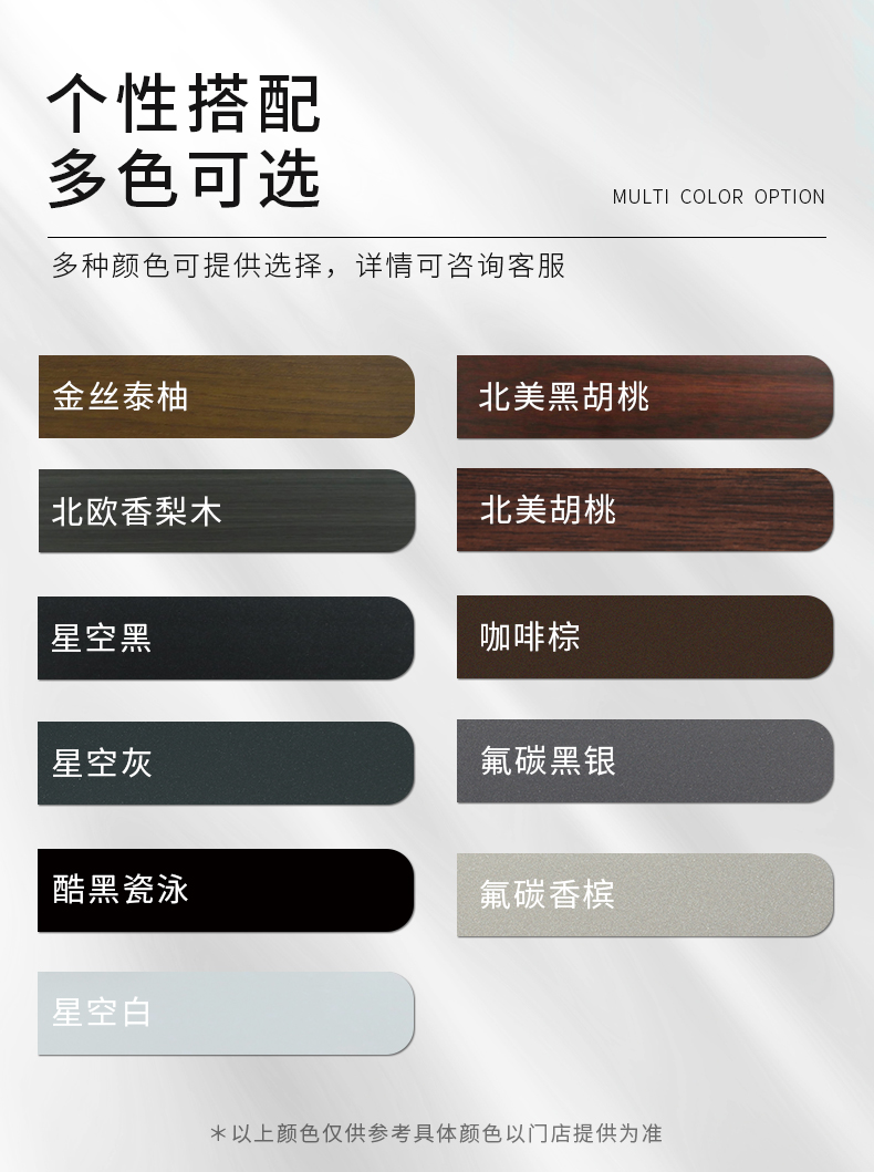 內(nèi)色:巴西花梨、印度紫檀、紅櫻桃、柚木色、海南黃花梨、 白橡木、象牙白、氟碳香檳、氟碳黑銀、砂灰、咖啡黑