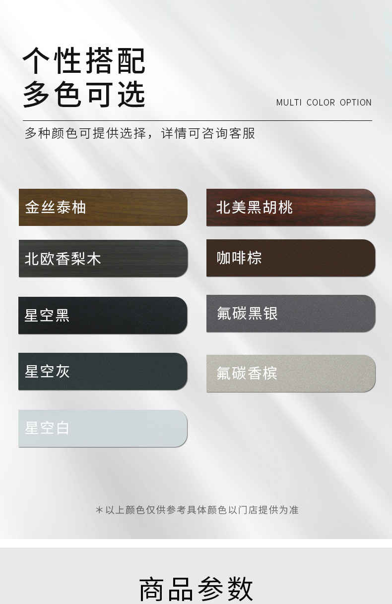 內(nèi)色:巴西花梨、印度紫檀、紅櫻桃、柚木色、海南黃花梨、 白橡木、象牙白、氟碳香檳、氟碳黑銀、砂灰、咖啡黑